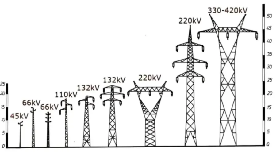 このプロセス中に、鉄の塔と送電と変換電圧の間には次の関係があります。
